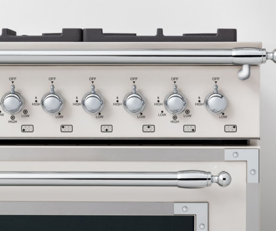The bright chrome handles found on the Heritage Series are replicas of the handrail found on the original Bertazzoni stoves. The look is across all Heritage Series to bring a traditional finish to the kitchen.