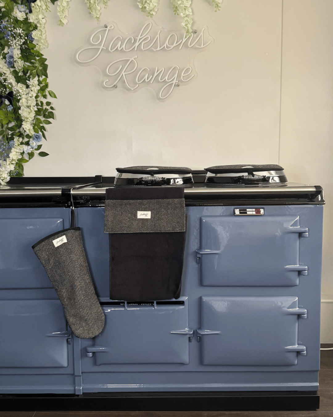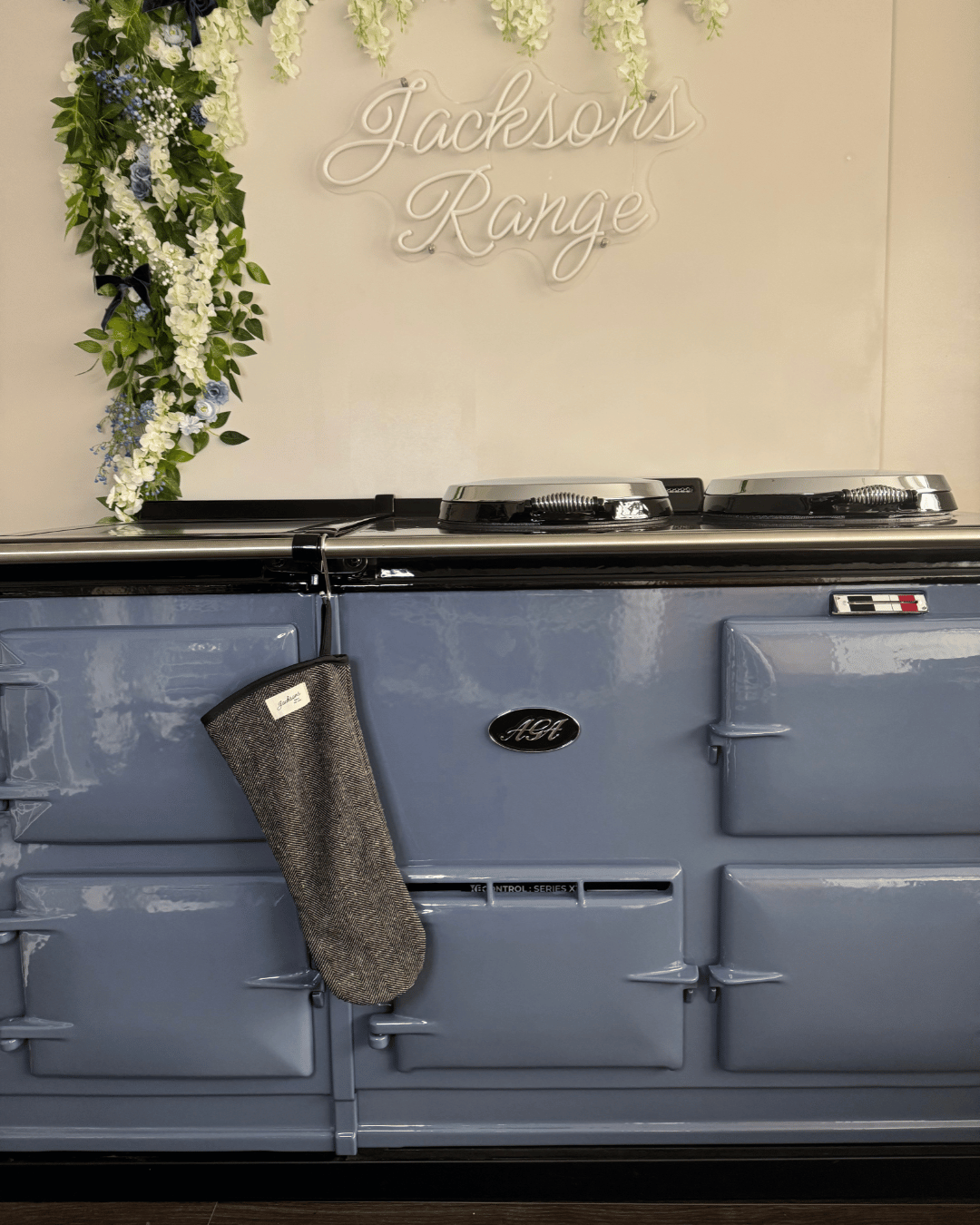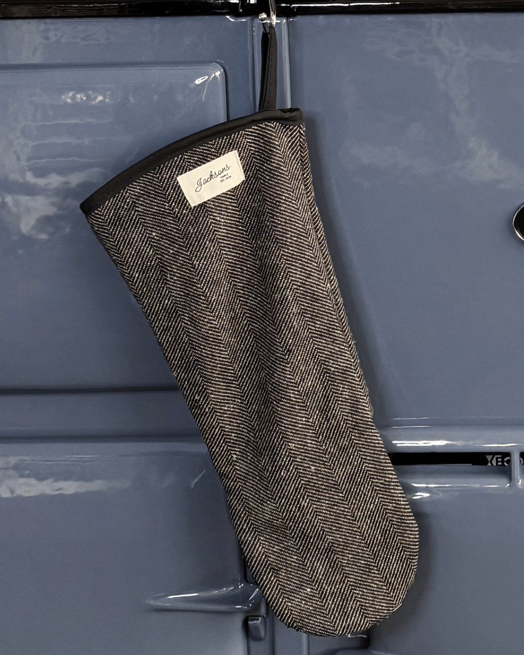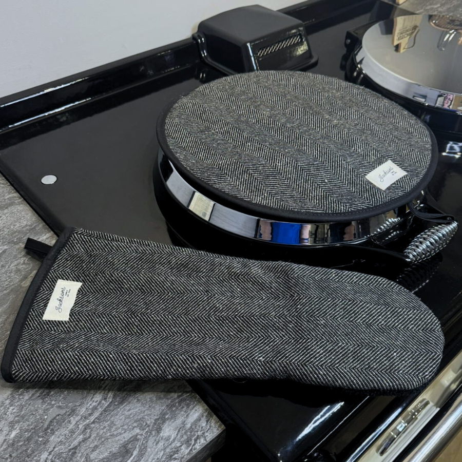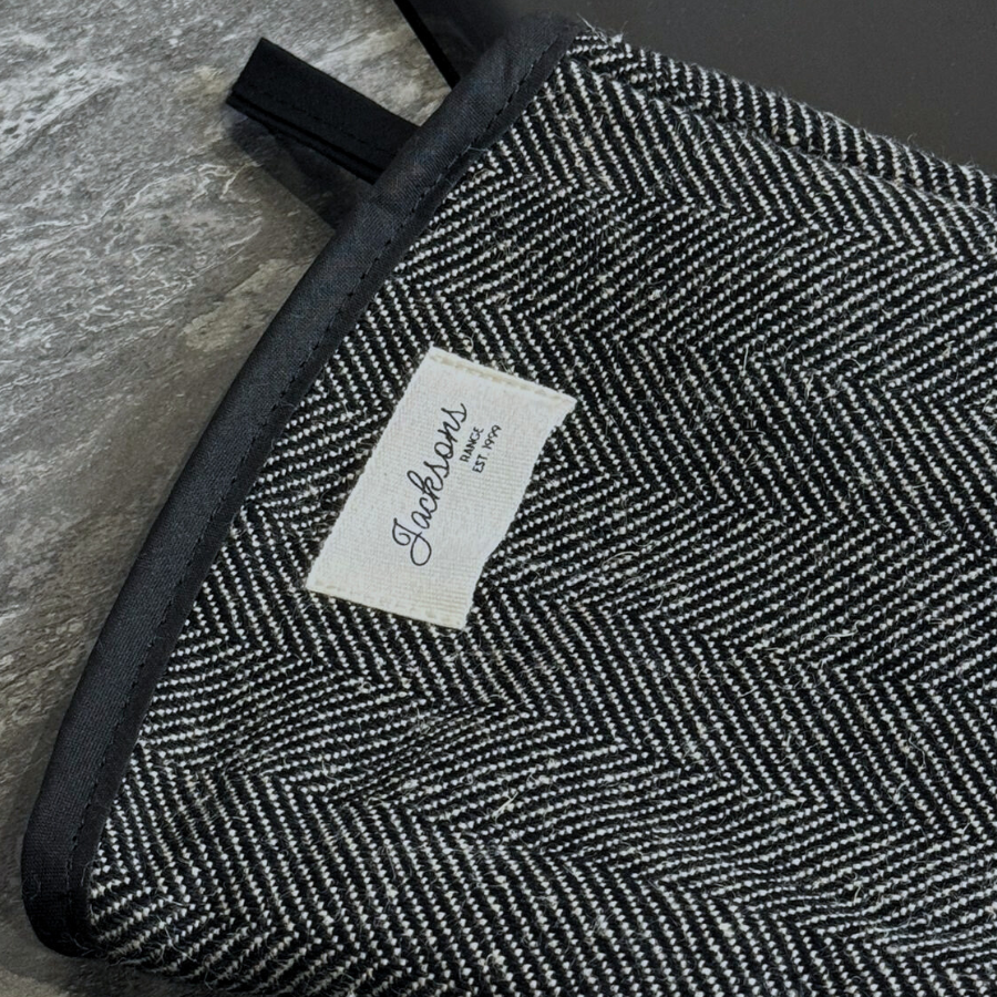 A beautiful Coal pattern gauntlet for any range cooker owner! Our simple design can be matched with insulated hob covers, hanging towels and tea towels! These gauntlets are 44cm long, providing mid-arm protection when reaching deep into the oven, meaning it is well-suited to reach into the ovens of range cookers. Extremely high quality including a steam block barrier, made from 100% cotton, and very easy to use with an integral thumb grip providing extra maneuverability. Bringing a homely feel to any style of kitchen, finished with our ‘Jacksons Ranges’ woven cotton label.
