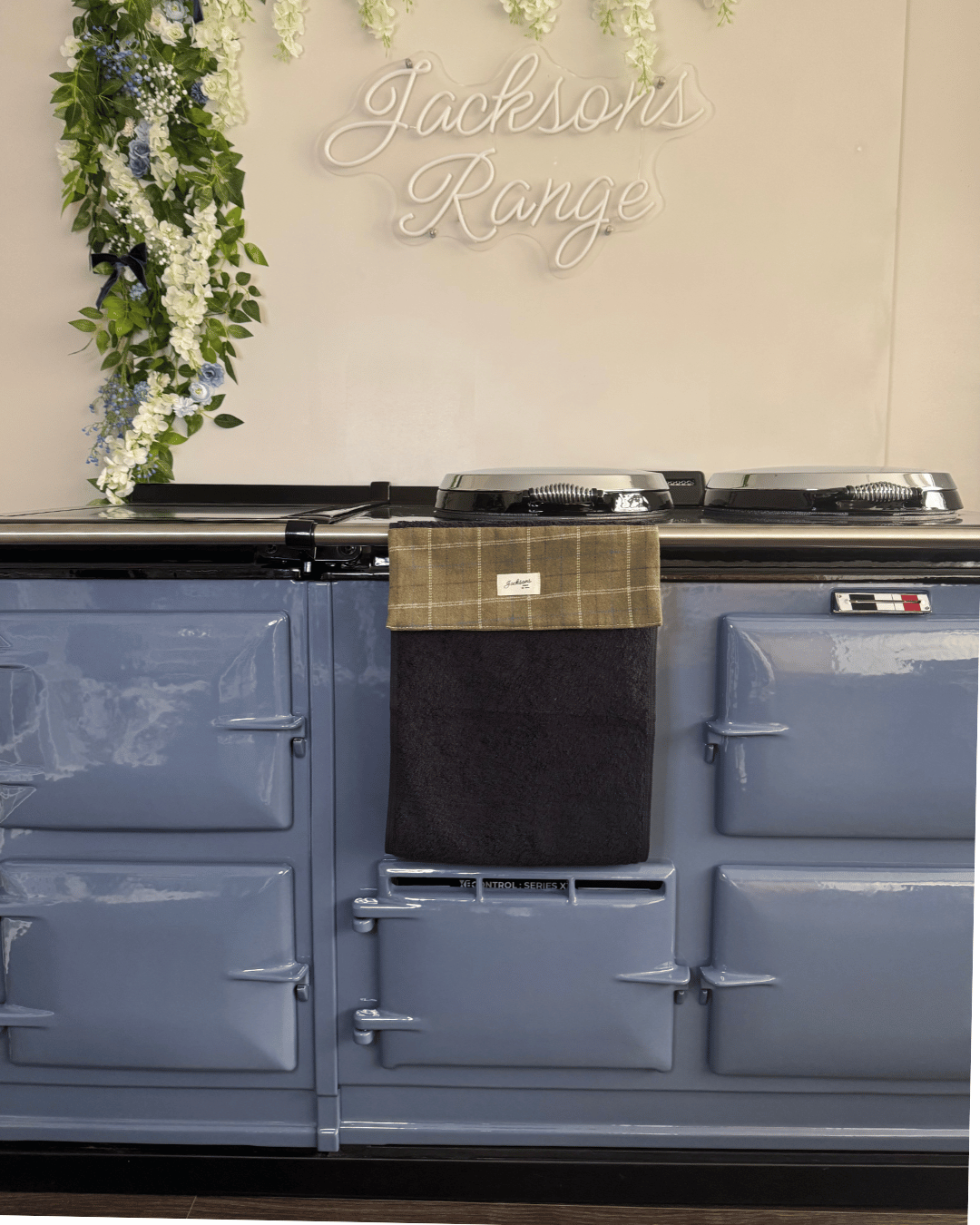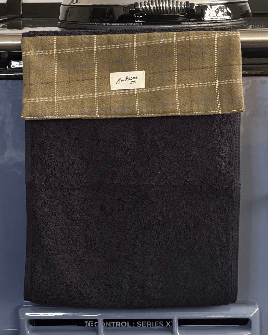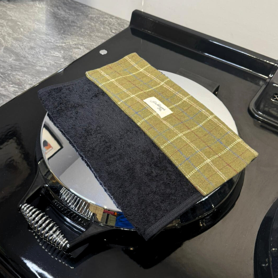 Our beautiful ‘Farmer Tweed’ pattern hanging towel designed for any range cooker owner! Our design can be matched with insulated hob covers, tea towels and gauntlets! This practical hanging towel is made up of a loop held together with a hook and loop strip that hangs on the towel rail of your cooker for easy use. The cute harvest design also hides marks and stains effectively. The toweling is absorbent, soft and made of high quality. Wash with hook and loop strip attached to avoid pulling towel! Made from 100% cotton and brings a homely feel to any style of kitchen, finished with our ‘Jacksons Ranges’ woven cotton label.