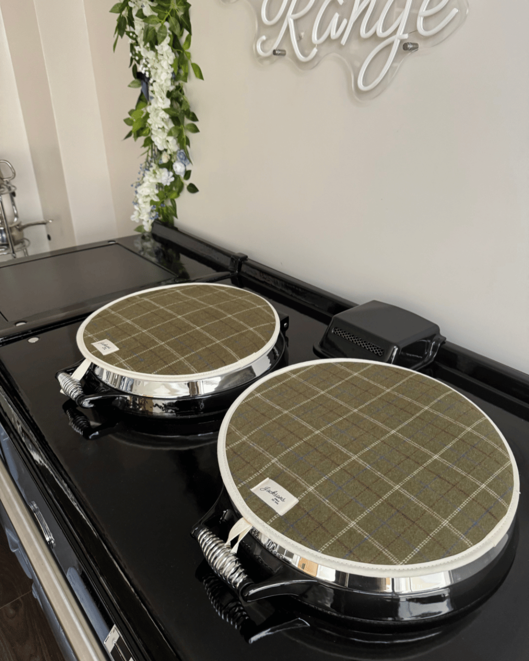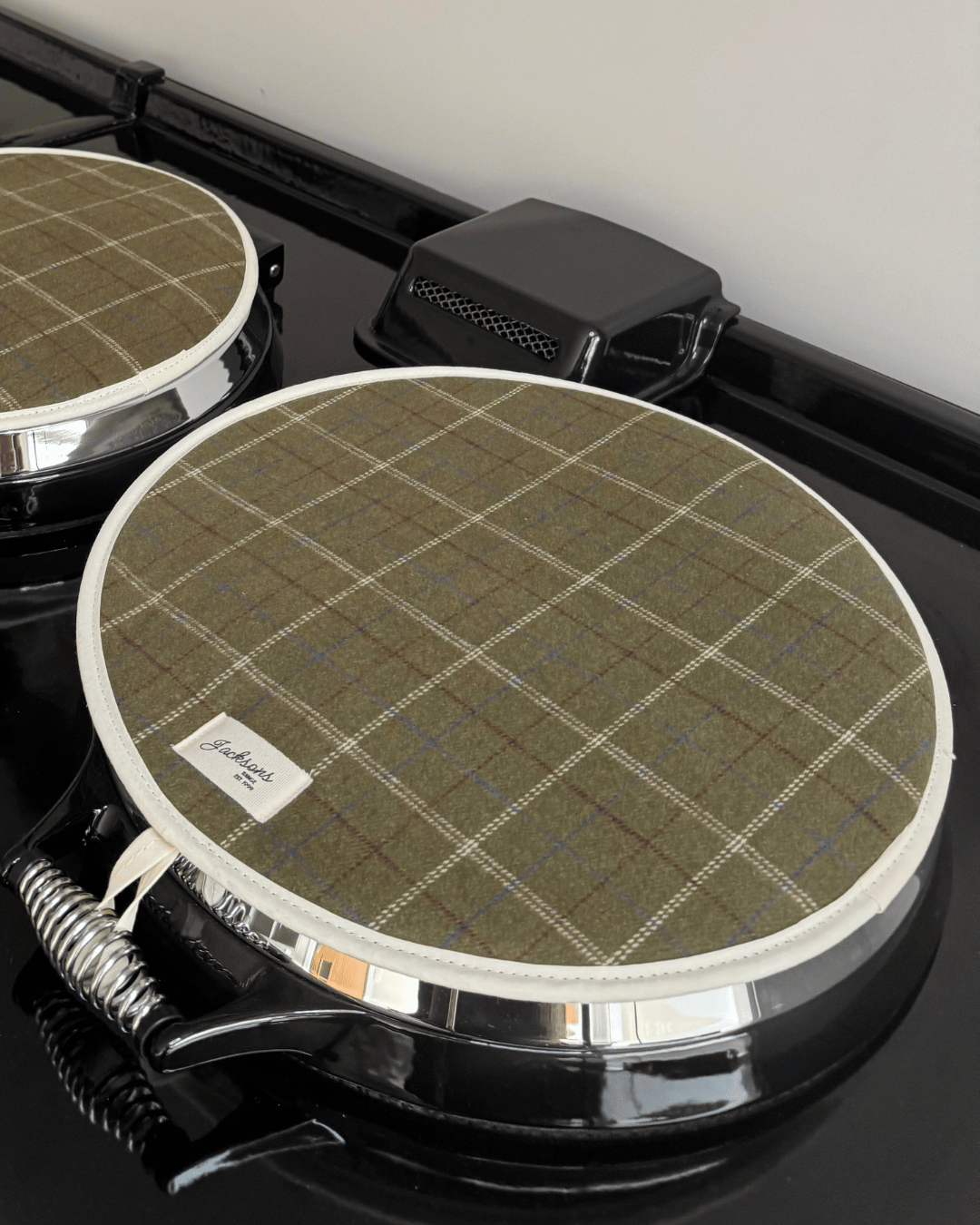 A beautiful Farmer Tweed pattern for any range cooker owner! Our simple design can be matched with gauntlets, hanging towels and tea towels! Highly insulating design, that creates a steam barrier and protects your lids. Made in the UK with 100% cotton for a thicker feel, complete with a hanging hook, helping to hang correctly when the lid is up. These hob covers bring a homely feel to any style of kitchen, finished with our ‘Jacksons Ranges’ woven cotton label.