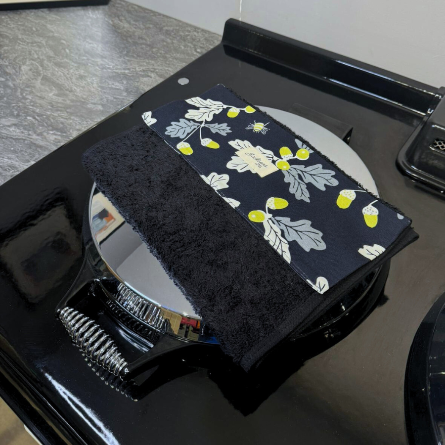 Our beautiful ‘Harvest’ pattern hanging towel designed for any range cooker owner! Our Harvest design can be matched with insulated hob covers, tea towels and gauntlets! This practical hanging towel is made up of a loop held together with a hook and loop strip that hangs on the towel rail of your cooker for easy use. The cute harvest design also hides marks and stains effectively. The toweling is absorbent, soft and made of high quality. Wash with hook and loop strip attached to avoid pulling towel! Made from 100% cotton and brings a homely feel to any style of kitchen, finished with our ‘Jacksons Ranges’ woven cotton label.