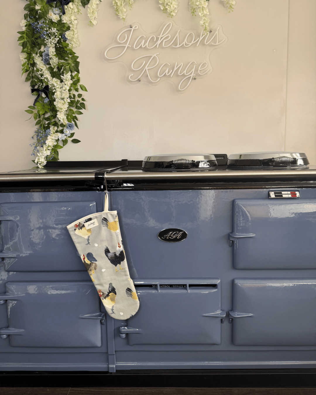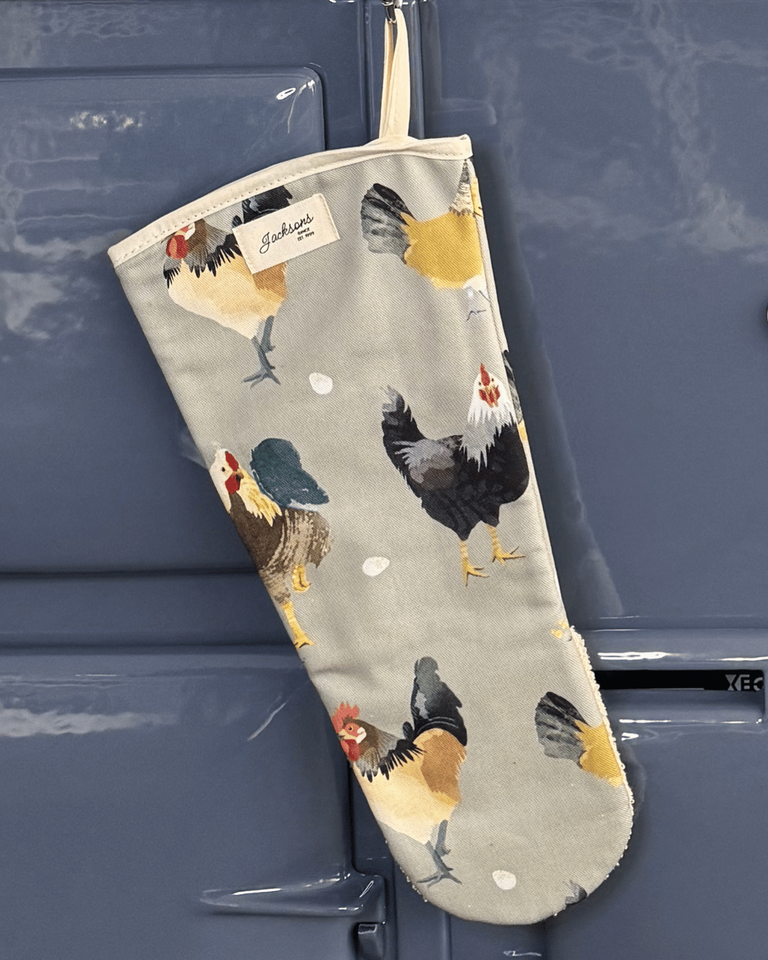 A beautiful hen & Rooster pattern gauntlet for any range cooker owner! Our simple design can be matched with insulated hob covers, hanging towels and tea towels! These gauntlets are 44cm long, providing mid-arm protection when reaching deep into the oven, meaning it is well-suited to reach into the ovens of range cookers. Extremely high quality including a steam block barrier, made from 100% cotton, and very easy to use with an integral thumb grip providing extra maneuverability. Bringing a homely feel to any style of kitchen, finished with our ‘Jacksons Ranges’ woven cotton label.