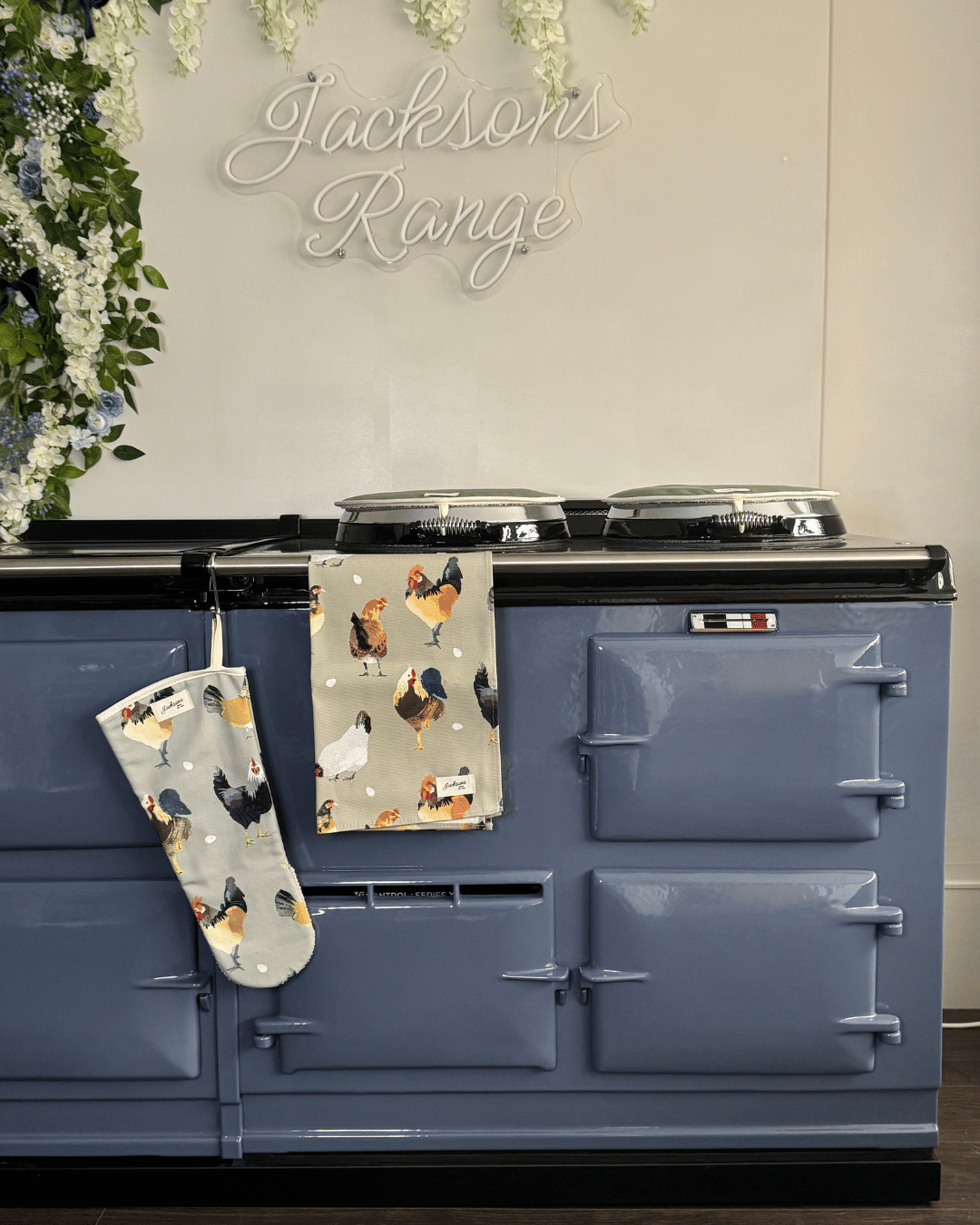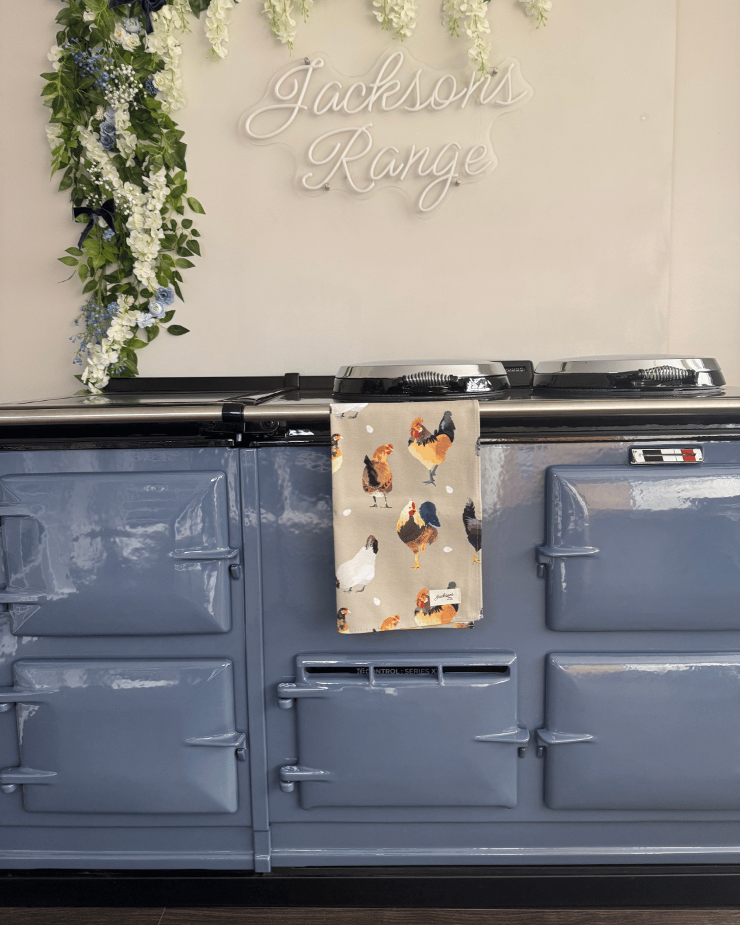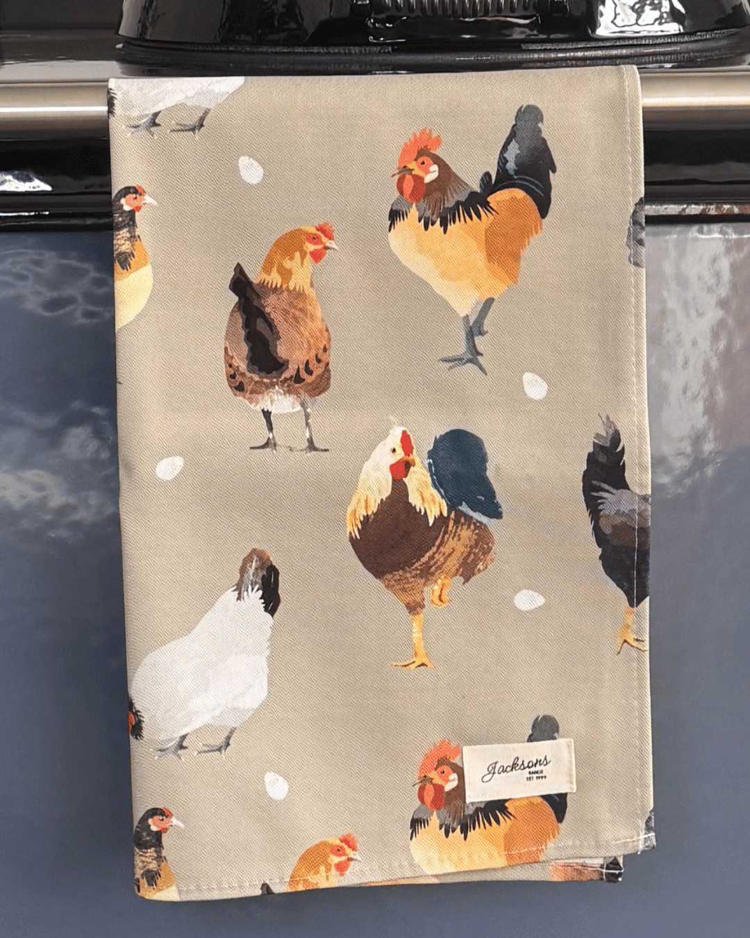 A beautiful Hen & Rooster tea towel for any range cooker owner! Our simple design can be matched with insulated hob covers, hanging towels and gauntlets! Extremely high quality, made from 100% cotton, and a loop located on the top left corner to hang up easily. Bringing a homely feel to any style of kitchen, finished with our ‘Jacksons Ranges’ woven cotton label.